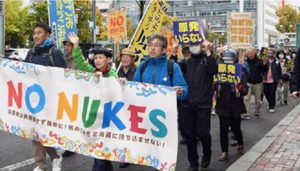 集会後、市内中心部を「再稼働反対、原発いらない」とコールを響かせ、デモ行進しました。