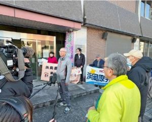 中電静岡支店前には20人以上が駆けつけ、「浜岡原発は廃炉に」「原発いらない」などが書かれた横断幕やプラカードを掲げました。日本共産党からは、鈴木せつ子前県議、森大介県委員長らが参加しました。