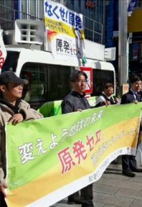 労働組合や医療・平和・農業・女性・法律家団体などで構成する原発をなくす全国連絡会は16日、東京・新宿駅前で、原発ゼロと再生可能エネルギーへの転換を訴えるイレブン行動に取り組み、請願署名への協力を訴えました。