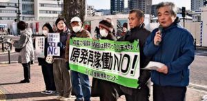 ふくしま復興共同センター(野木茂雄代表委員)は13日、福島駅前で、東京電力柏崎刈羽原発(新潟県)の再稼働反対を訴えるイレブン行動に取り組みました。参加者は、「原発再稼働NO!」の横断幕やプラカードを掲げ、署名への協力を呼びかけました。