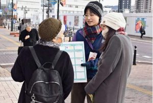 シールアンケートに応じた高校生3人組は、「ジェンダー平等は大事。一人ひとりが大切にされる社会がいい」「進学するから学費を下げてほしい」など政治への要求を語りました。高齢女性は「年金」にシールを貼り、「応援しています。がんばって」とエールを寄せました。
