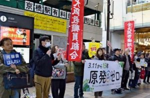 原発ゼロの会・大阪は7日、「なくせ原発!再稼働はんたい! おおさか集会」を大阪市内で開き、215人が参加しました。集会後、JR京橋駅前でスタンディングと署名行動に取り組みました。