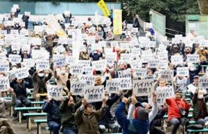 「バイバイ原発3・7きょうと」集会が7日、京都市東山区の円山公園音楽堂で開かれ、1000人が参加しました。デモ行進では「I LOVE京都 原発いらない」などと唱和し、沿道にアピールしました。